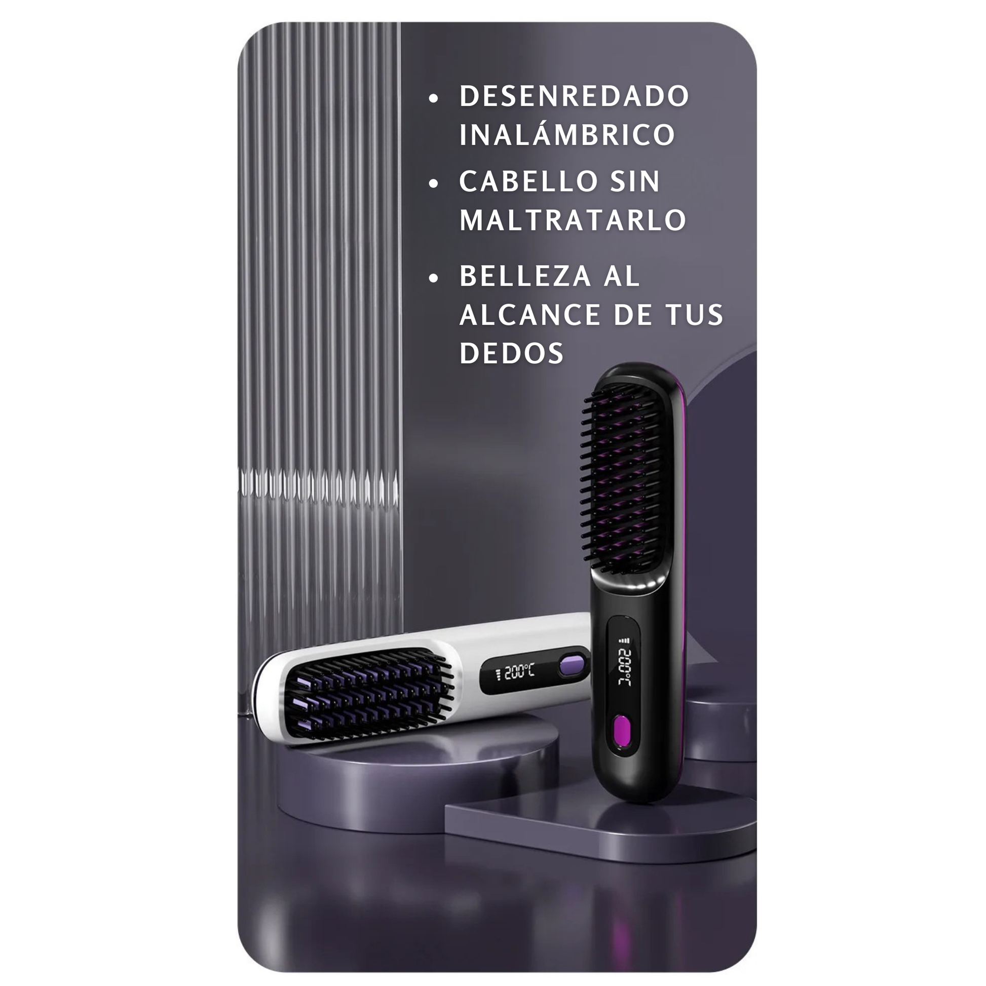 El aliado perfecto para un peinado impecable en cualquier momento. Combina plancha + cepillo para alaciar, desenredar y estilizar tu cabello de forma rápida, segura y sin cables.